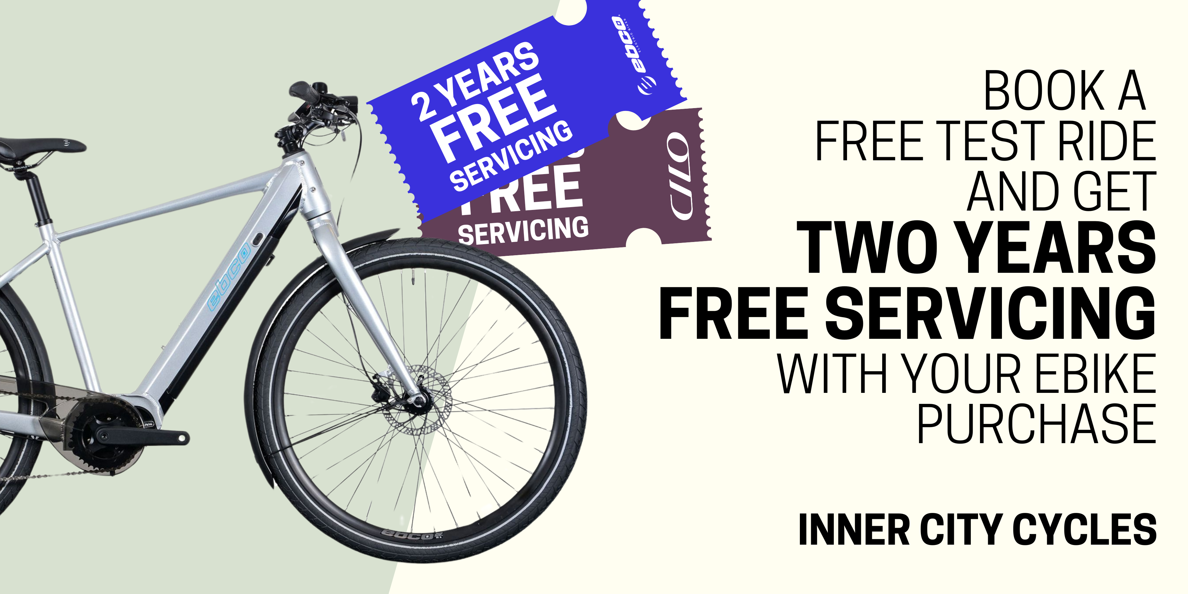 Online offer: Book a free test ride at Inner City Cycles and get 2 years free servicing with a new EBCO or Cilo eBike